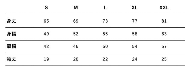 サイズS:身丈 65cm × 身幅 49cm × 肩幅 42cm × 袖丈 19cm